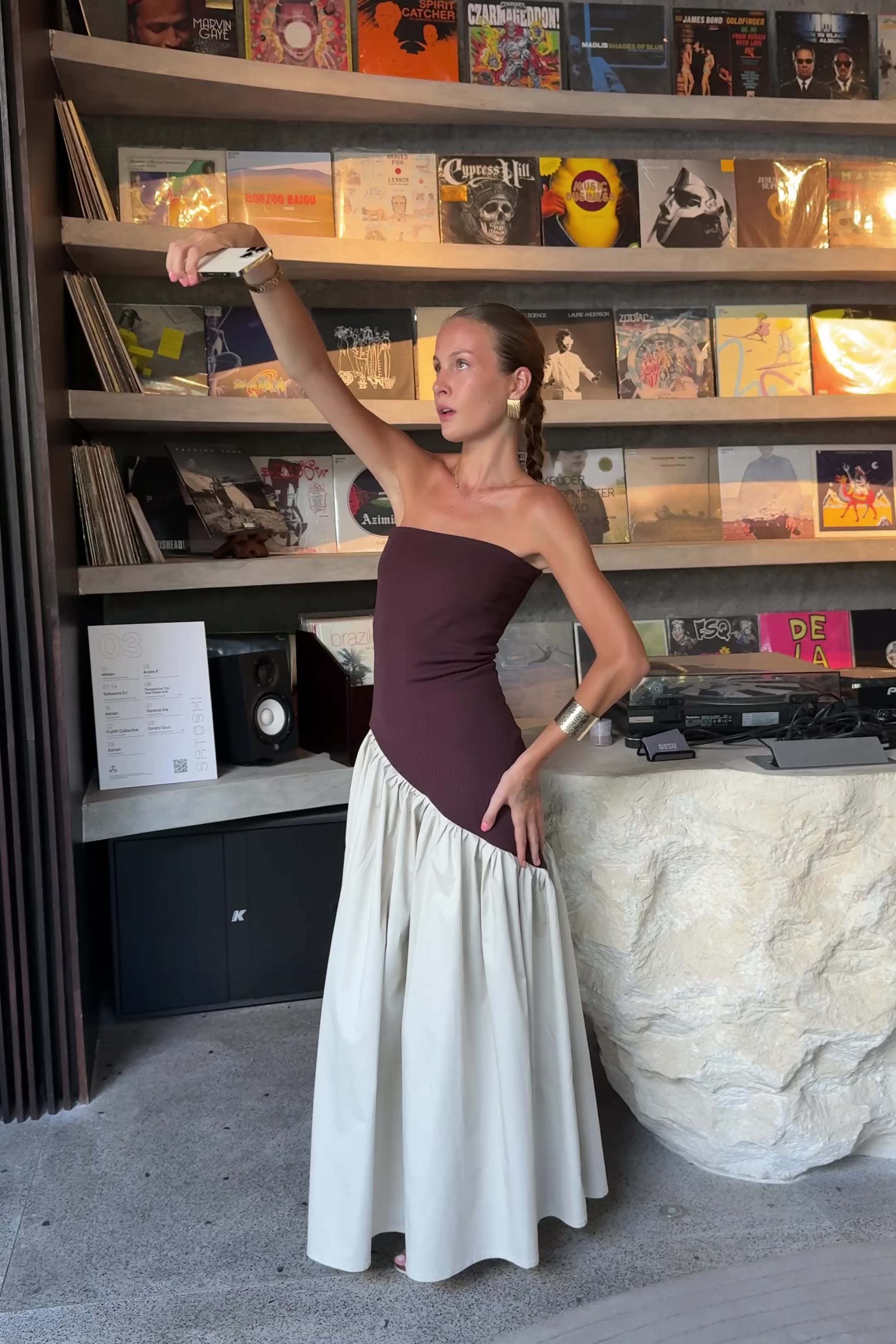 ASYMMETRIC TWO TONE GATHER DRESS in BROWN/ECRU