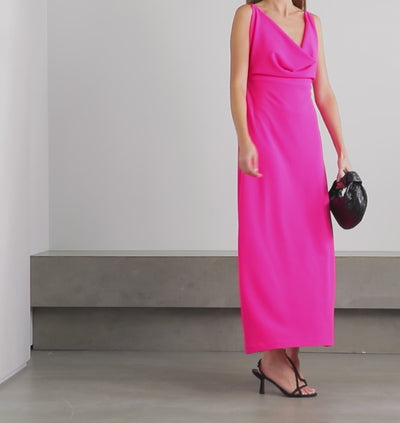 Cut from medium weight stretch crepe, this piece drapes around the neckline with an open back detail. Flatters and moves with the figure, perfect for any special occasion.
