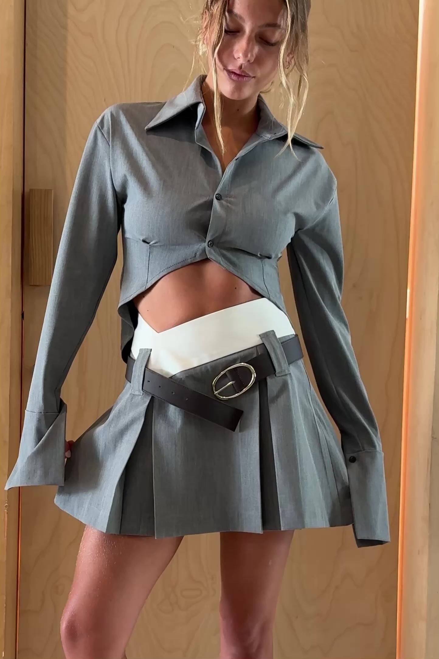 Designed with a sharp, angular hem, this cropped silhouette adds a bold architectural touch to your wardrobe. The soft wool blend fabric falls on the body beautifully, while the clean lines and tailored fit create a polished yet contemporary look. Perfect for pairing with high-waisted trousers, skirts, or layering.