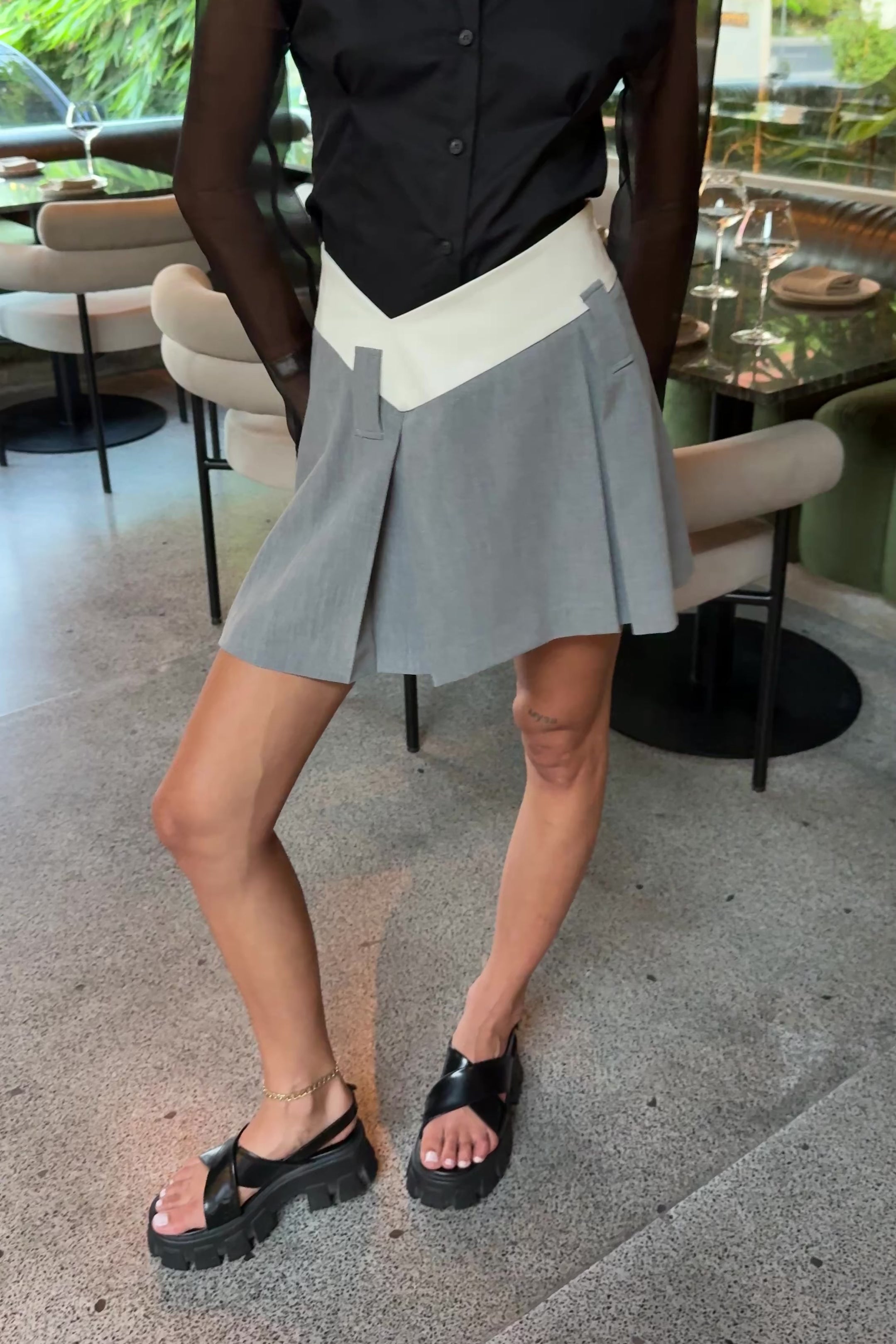PLEATED ANGLED WAIST MINI SKIRT in IVORY/GREY
