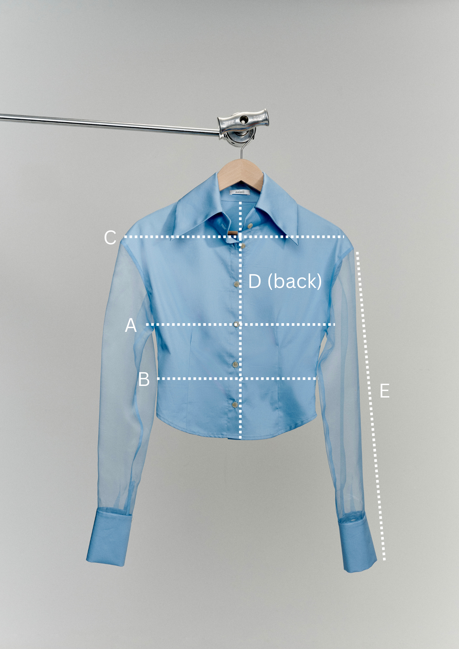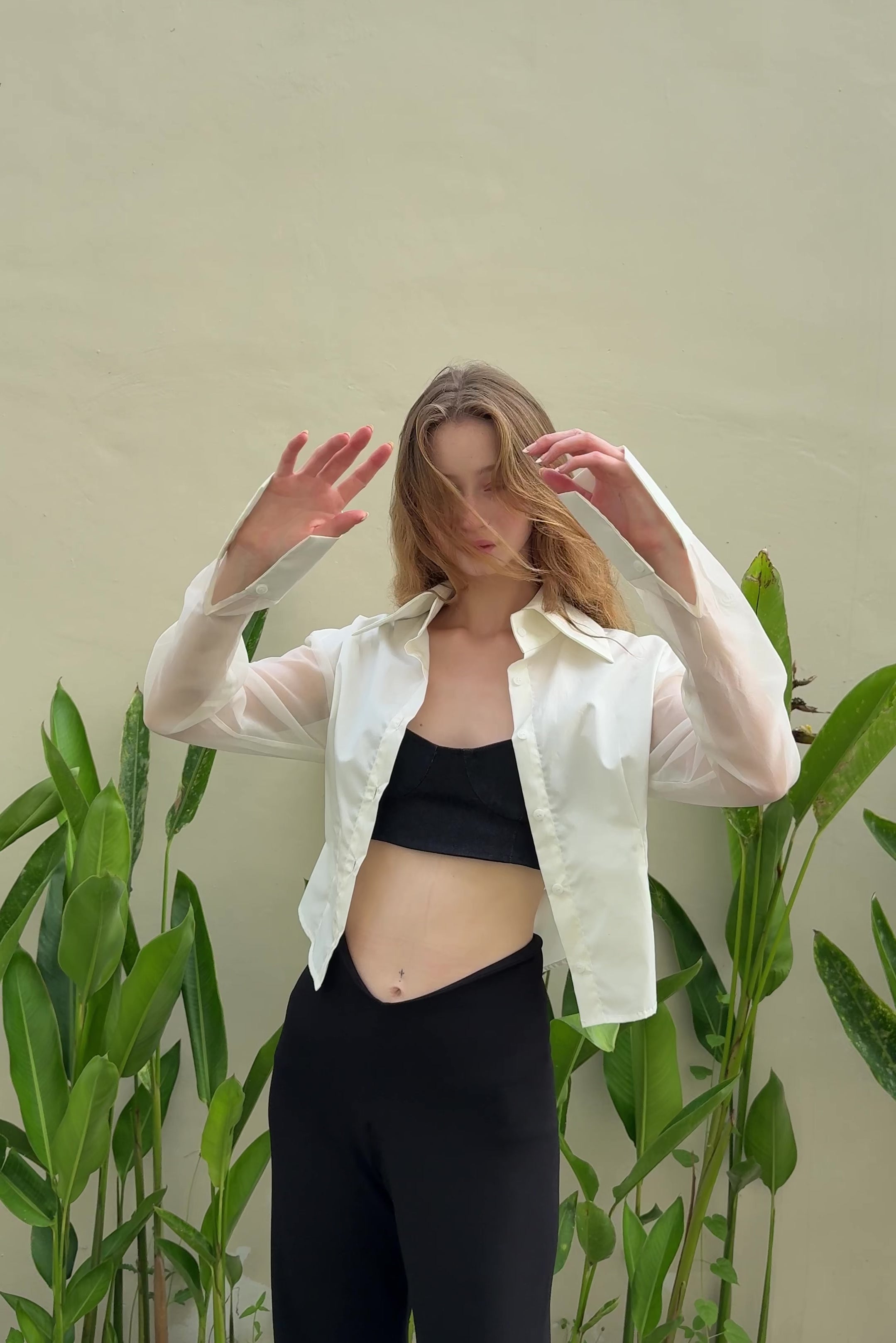 Introducing our Silk Organza Sleeve Shirt in White. A modern twist on traditional shirting, this versatile piece seamlessly transitions from office attire to holiday wear. This shirt features a solid shoulder line with a tailored waist for a flattering fit along with aaizél signature large collar and cuffs. The sheer silk organza sleeves add a touch of elegance and contrast to the classic body, perfect for layering over a swimsuit or flowy pants.