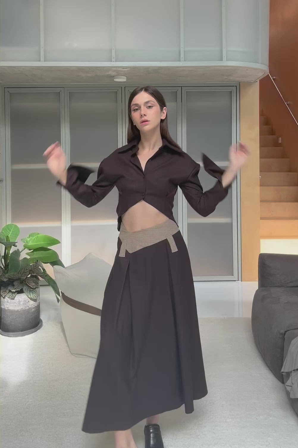 TAILORED ANGLED WAIST LONG SKIRT in BISCUIT CHECK/BROWN