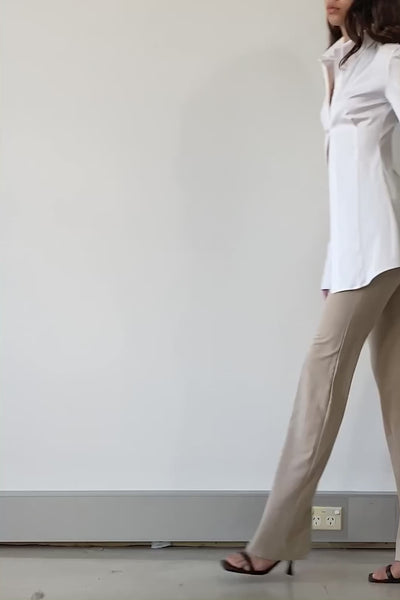 A classic aaizél pant, this two tone straight pant is cut from repurposed fabrics. It features v-back detail and front flap pockets.